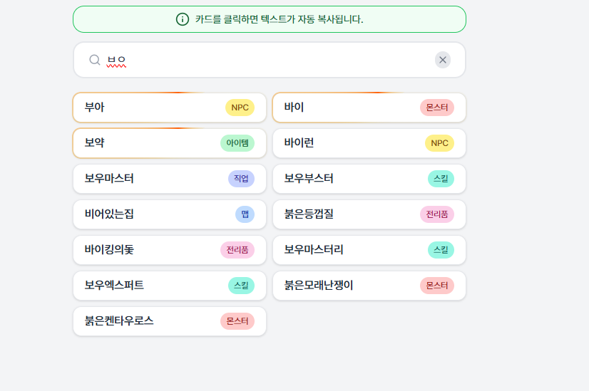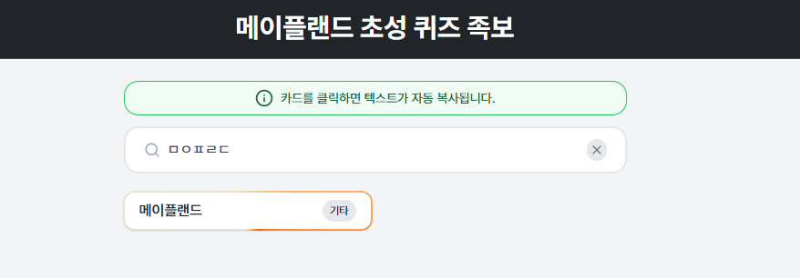 메이플랜드 2주년 이벤트 초성 퀴즈 족보 검색 사이트 - 초성 입력만으로 검색 후 클릭 한 번으로 복사하세요!